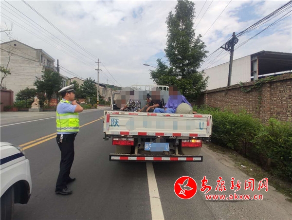 7月31日15時許,大隊執(zhí)勤民警在316國道沿線開展路面巡邏,行至恒口東大門時,發(fā)現(xiàn)一輛號牌為皖AC***C號輕型欄板貨車后車廂有違規(guī)載人嫌疑,巡邏民警立即上前攔停,示意駕駛人李某某停車接受檢查。經(jīng)查,該貨車核定載人數(shù)為5人,實際載9人,貨車車廂違法載客4人,屬于貨車違法載客的嚴重交通違法行為。