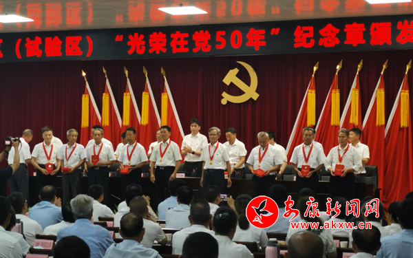 在慶“七一”表彰大會上,全體參會黨員面對鮮紅的黨旗,高舉右手,重溫入黨誓詞,鏗鏘嘹亮的宣誓聲響徹會場,激蕩人心,昭示著全區(qū)黨員矢志不渝為黨和人民事業(yè)不懈奮斗的堅(jiān)定信念。會上,為高劍村黨支部等10個先進(jìn)基層黨組織、王開昌等10名優(yōu)秀黨務(wù)工作者、王天蒼等20名優(yōu)秀共產(chǎn)黨員代表分別頒發(fā)了榮譽(yù)證書,為“光榮在黨五十年”的10名老黨員代表頒發(fā)了紀(jì)念章。
