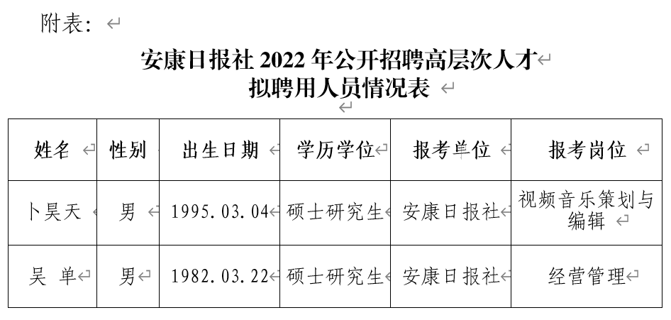 安康日報(bào)社2022年公開招聘高層次人才擬聘用人員公示
