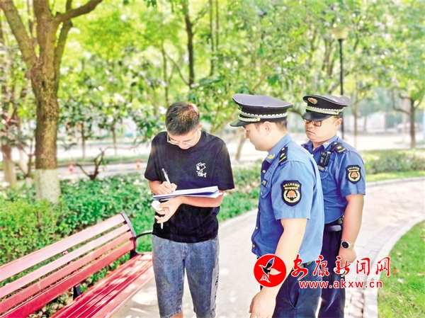 連日來,漢濱區(qū)、高新區(qū)城管部門在中心城區(qū)全域持續(xù)開展“文明有我 痰吐文雅”專項(xiàng)糾治執(zhí)法行動。城管執(zhí)法人員依據(jù)規(guī)定,對“隨地吐痰”等不文明行為人,處以十元以上五十元以下的罰款,或以發(fā)朋友圈集贊的方式接受柔性執(zhí)法免于罰款。據(jù)統(tǒng)計(jì),截至9月6日,已開展現(xiàn)場處罰258人次,其中開具罰單62張。圖為隨地吐痰的市民正在接受行政處罰。屈明佳 攝