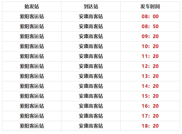 由紫陽(yáng)客運(yùn)站發(fā)往安康高速客運(yùn)站,每日12班,發(fā)車(chē)時(shí)間為: