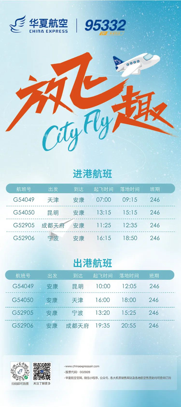 12月26日起,安康富強機場新增“安康=昆明”“安康=天津”航線。具體航線航班如圖: