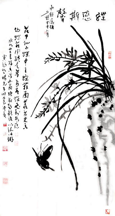 1988年,中國畫壇號稱“蝶王”的王冰如女士,以80歲高齡回到她曾工作生活10年之久的第二故鄉(xiāng)安康舉辦畫展,并且以詩書畫會友,特邀旸光先生和金州著名詩人劉寅初老人同游香溪,冰如老師興之所至,巧繪墨蝶,說道“人言寅初老弟有曹子健七步成詩之才,今日以十步為限,將此畫為題,賦詩一首,旸光老弟書于其上如何?”寅初老只走了三步便道有了,于是順口吟誦,旸光先生揮毫急就“花中仙子蝶中王,蝶舞籣叢花更香,化蝶莊周終是夢,喜看蝶王飛安康?!币还P流暢的行草躍然于畫上,相輔相成,真是詩情畫意天作之合。一幅難遇難得難覓的“三絕圖”誕生了。冰如老師感慨萬千,說到“二位弟臺才高八斗,只可惜待在安康這個貧瘠的地方被埋沒了也!”這個場面是一種巧合,正是旸光先生“萬事隨緣”的結晶,爾后經(jīng)書壇大家陳少默先生為之題跋做款,更是錦上添花,成了四絕圖。冰如、少默、旸光、寅初先生已然作古,這段翰墨丹青之情,將永存世間傳為藝術佳話。