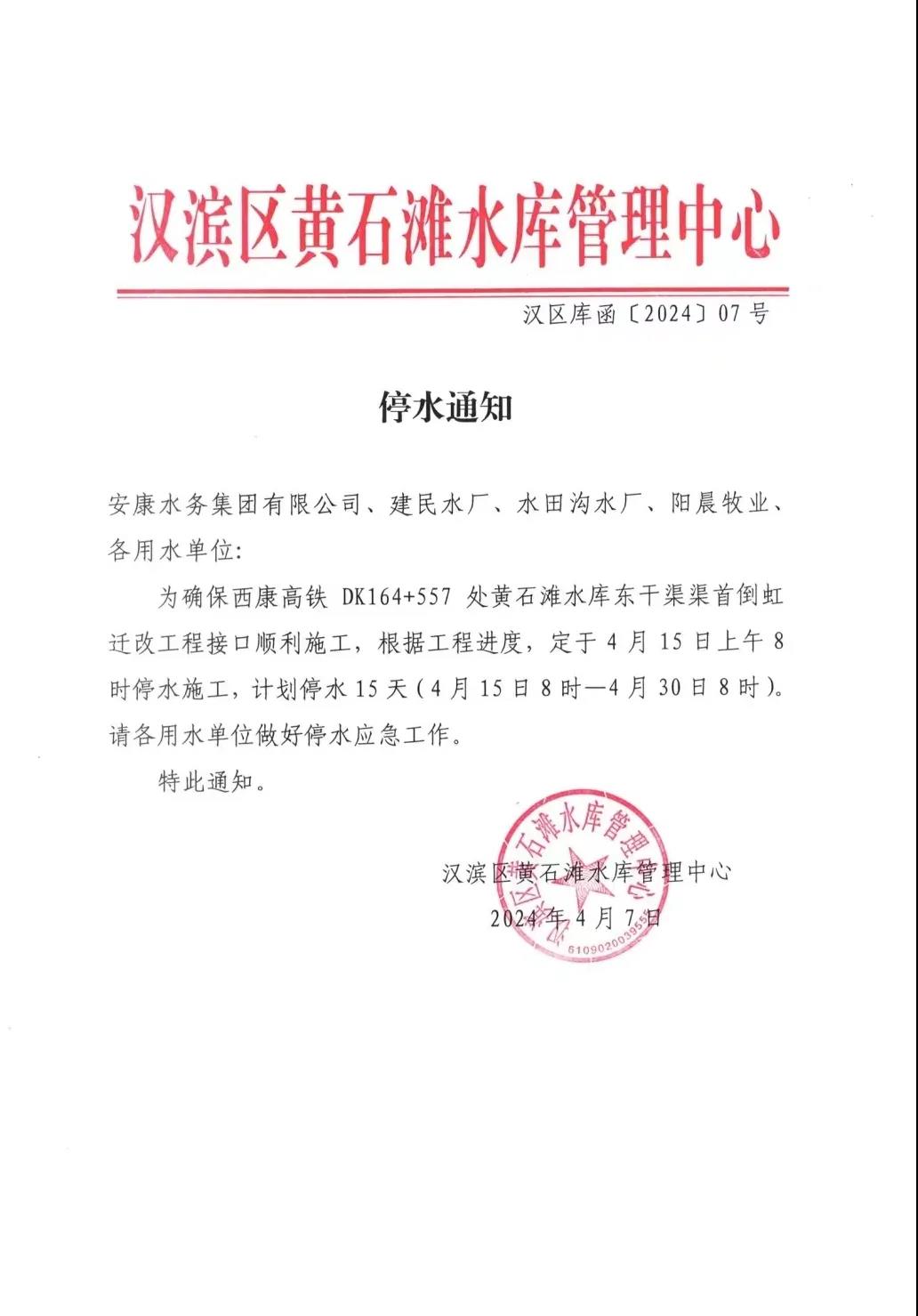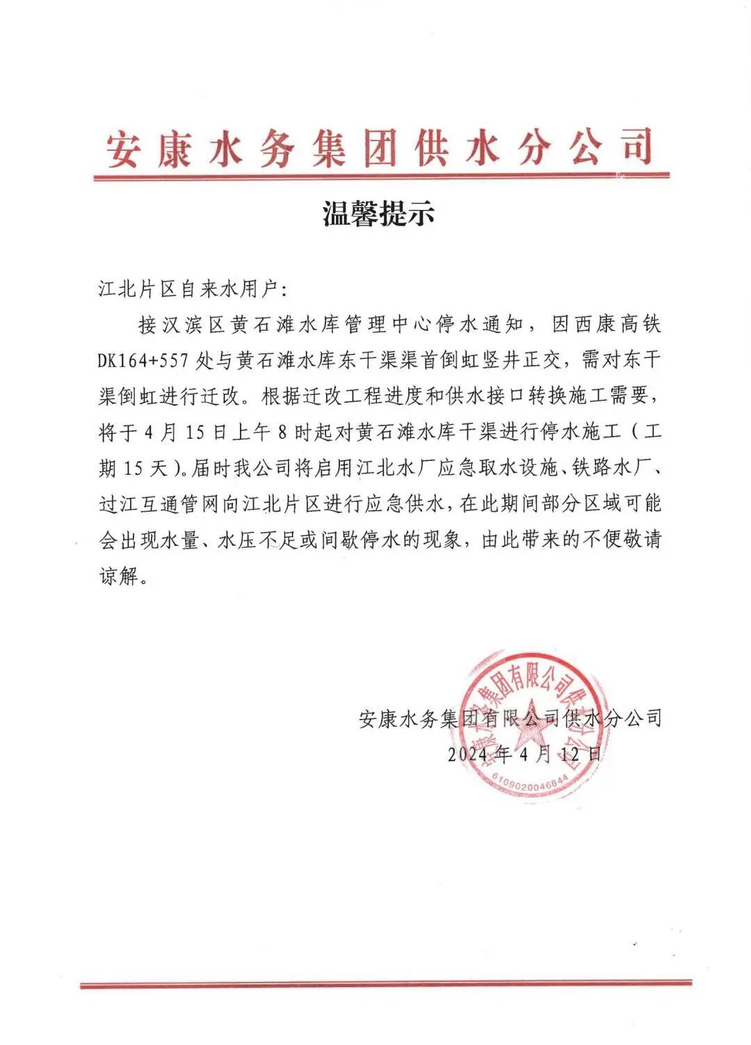 本網(wǎng)訊 4月12日,安康水務(wù)集團(tuán)有限公司供水分公司發(fā)布停水通知:因西康高鐵DK164+557處與黃石灘水庫(kù)東干渠渠首倒虹豎井正交,需對(duì)東干渠倒虹進(jìn)行遷改。根據(jù)遷改工程進(jìn)度和供水接口轉(zhuǎn)換施工需要,將于4月15日上午8時(shí)起對(duì)黃石灘水庫(kù)干渠進(jìn)行停水施工(工期15天)。