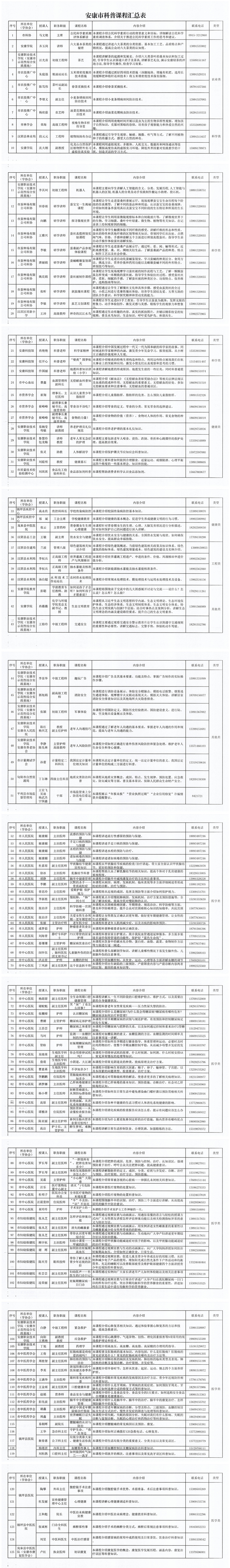 為認(rèn)真落實(shí)《安康市貫徹<全民科學(xué)素質(zhì)行動(dòng)規(guī)劃綱要(2021-2035年)實(shí)施方案》,增強(qiáng)我市科普供給能力,助力提升全民科學(xué)素質(zhì),經(jīng)前期征集、審核整理,形成了安康市科普課程,共計(jì)125門課,內(nèi)容包括但不限于科學(xué)技術(shù)、農(nóng)業(yè)技術(shù)、工程技術(shù)、衛(wèi)生保健、生態(tài)環(huán)保、應(yīng)急處置、運(yùn)動(dòng)健康、生活常識(shí)、網(wǎng)絡(luò)安全等科普知識(shí)?,F(xiàn)將安康市科普課程予以公布,并就有關(guān)事項(xiàng)通知如下: