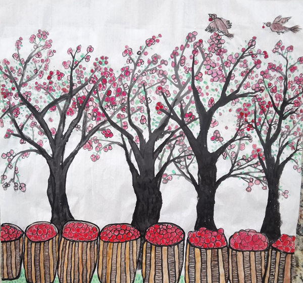 學(xué)校國畫社團的孩子們,經(jīng)過兩天的緊張培訓(xùn)、繪制草圖、精心創(chuàng)作,十余名學(xué)生畫出了美麗鄉(xiāng)村的豐收場景,畫出了孩子們美好生活的快樂情趣,也畫出了漢調(diào)二黃戲劇人物水墨畫印象,從多角度贊美了美麗家園、幸福安康。在安康兒童美育專家宋安平和鄭字堂、王彬等老師的精心輔導(dǎo)下,孩子們的國畫作品,將選送參加中央美術(shù)學(xué)院少兒美術(shù)研究中心主辦的展覽。