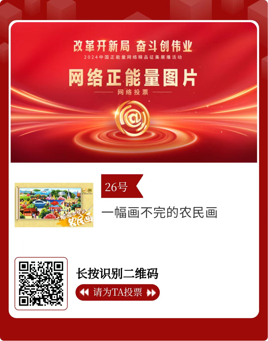 改革開新局,奮斗創(chuàng)偉業(yè)。由中央網(wǎng)信辦主辦的2024中國正能量網(wǎng)絡(luò)精品征集展播活動今天啟動網(wǎng)絡(luò)展播投票。