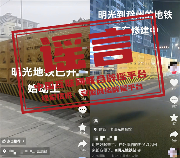 真相:近日,網(wǎng)民“張**”“沙**”等發(fā)布視頻,編造并傳播“明光地鐵已開始動工”相關(guān)虛假信息,并配以誤導(dǎo)性視頻,引發(fā)關(guān)注和討論。經(jīng)核實,相關(guān)視頻內(nèi)容對應(yīng)區(qū)域施工項目并非修建地鐵,網(wǎng)傳視頻系謠言。明光市委網(wǎng)信辦和市公安局已依法對張某、沙某等進(jìn)行批評教育,并要求其刪除相關(guān)不實信息。(來源:“安徽省互聯(lián)網(wǎng)違法和不良信息舉報”微信公眾號、明光市委網(wǎng)信辦)