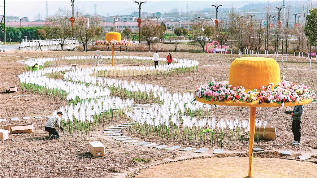 不遠處的迎賓公園里,另一組工作人員正沿著步道和綠化帶安裝布置蘆葦燈帶。一根根蘆葦狀的燈桿錯落豎立,待夜幕降臨時,將勾勒出公園蜿蜒的輪廓,營造出寧靜溫馨的夜間景致。