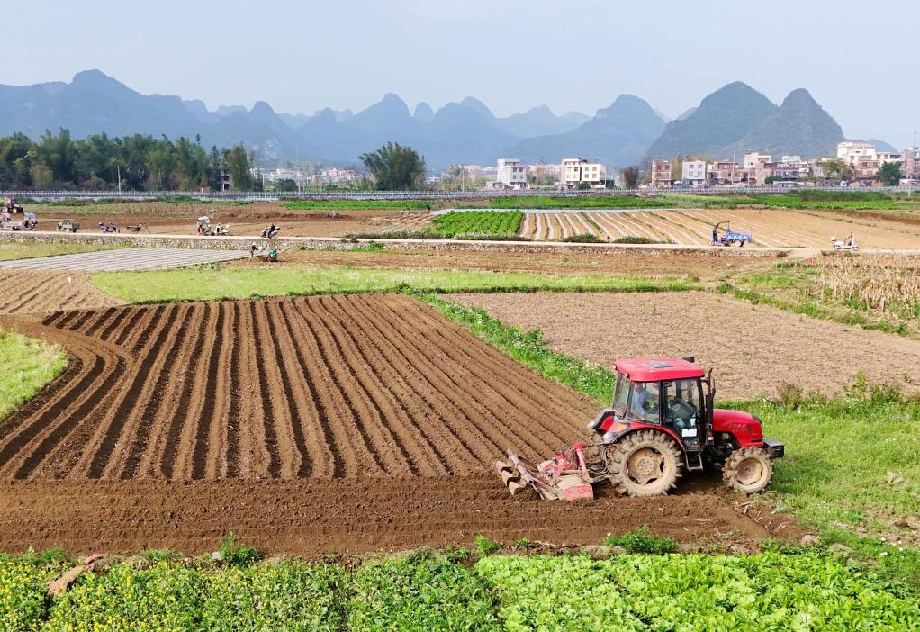 近日,廣西來(lái)賓市忻城縣城關(guān)鎮(zhèn)都樂村農(nóng)民駕駛農(nóng)機(jī)在翻耕田地,準(zhǔn)備種植玉米(無(wú)人機(jī)照片)。一年之計(jì)在于春,各地人們忙著翻耕土地、培育秧苗、檢修農(nóng)機(jī)、裝運(yùn)化肥,為春耕生產(chǎn)做準(zhǔn)備。新華社發(fā)(樊紹光 攝)