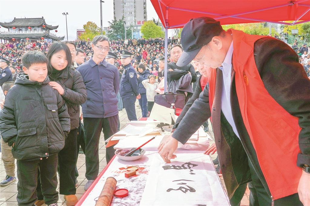 市集不僅有宣傳與服務,更有可看可學的文明實踐?;顒油ㄟ^宣傳展板集中展示漢濱區(qū)移風易俗成果與文明新風先進典型事跡,用身邊人、身邊事帶動群眾。非遺代表性傳承人現場詮釋勤儉美德,書法愛好者現場書寫福字與家訓,讓群眾在傳統(tǒng)文化熏陶中,潛移默化地接受新風教育?!胺沁z、書法和移風易俗結合得好,孩子也能受教育?!睅е⒆庸涫屑氖忻窭钆渴斋@滿滿、笑意盈盈。