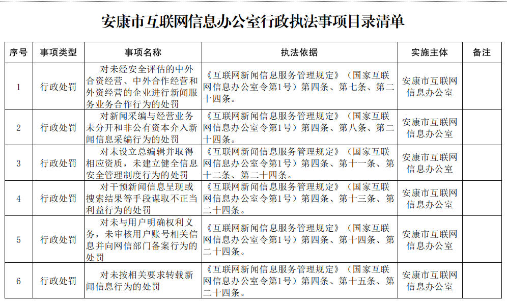 安康市互聯網信息辦公室行政執(zhí)法事項目錄清單