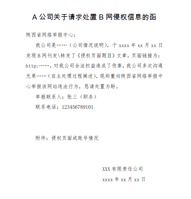 3.網(wǎng)絡(luò)侵權(quán)信息舉報(bào)請(qǐng)通過(guò)“侵權(quán)類”舉報(bào)入口提交,舉報(bào)人須實(shí)名舉報(bào),同時(shí)必須提交請(qǐng)求維權(quán)處置函件和詳實(shí)的舉證材料。陜西省網(wǎng)絡(luò)舉報(bào)中心受理省內(nèi)各級(jí)政府組織、企事業(yè)單位和個(gè)人的互聯(lián)網(wǎng)侵權(quán)舉報(bào),舉報(bào)行為執(zhí)行者須為政府、企事業(yè)單位等組織的責(zé)任部門或舉報(bào)主體本人,并清晰陳述侵權(quán)事實(shí)、侵權(quán)信息頁(yè)面鏈接、請(qǐng)求處置訴求等信息,舉證材料要盡可能詳實(shí)、完備。